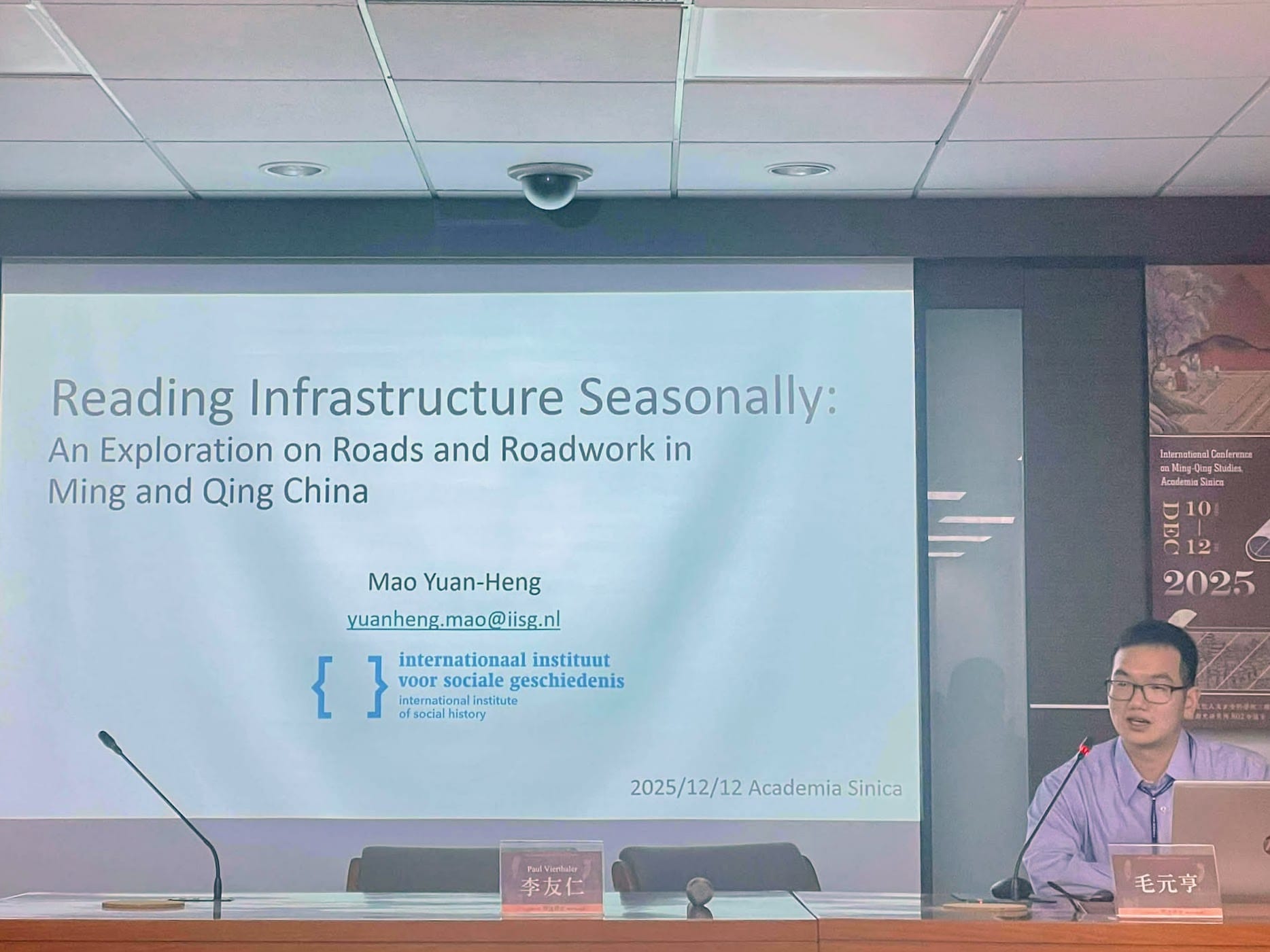 Dr. Yuan-Heng Mao presented his paper, "Reading Infrastructure Seasonally: An Exploration on Roads and Roadwork in Ming and Qing China," at the Leveraging Digital Humanities and Machine Learning to Study Large Ming and Qing Dynasty Datasets panel of the 2025 International Conference on Ming-Qing Studies, Academia Sinica in Taipei on December 12, 2025.